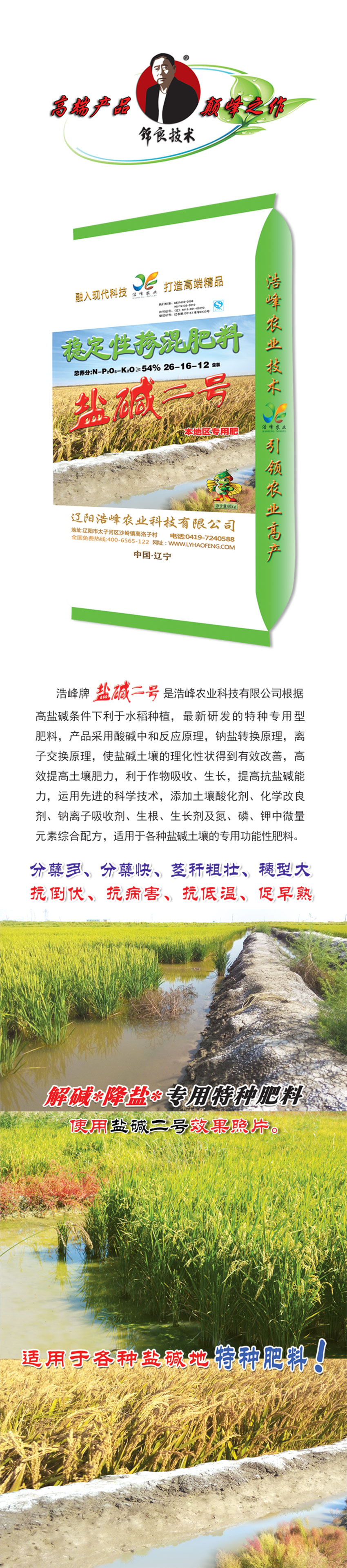 浩峰牌鹽堿二號(hào)是浩峰農(nóng)業(yè)科技有限公司根據(jù)高鹽堿條件下利于水稻種植,最新研發(fā)的特種專(zhuān)用型肥料,產(chǎn)品采用酸堿中和反應(yīng)原理,鈉鹽轉(zhuǎn)換原理,離子交換原理,使鹽堿土壤的理化性狀得到有效改善,高效提高土壤肥力,利于作物吸收、生長(zhǎng),提高抗鹽堿能力,運(yùn)用先進(jìn)的科學(xué)?,添加土壤藥F?、化学改良剂、脑u(píng)胱游占痢⑸?、生长剂及氮、磷、钾中微量元素综簢?shù)穭Μ室暶釉嶗种盐煎{寥賴(lài)淖ㄓ霉δ芐苑柿稀?