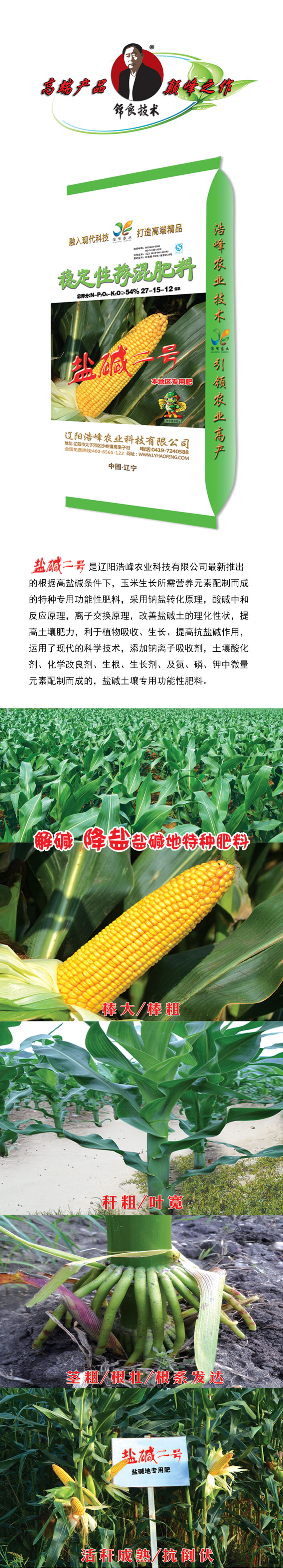 鹽堿二號(hào)是遼陽(yáng)浩峰農(nóng)業(yè)科技有限公司最新推出的根據(jù)高鹽堿條件下,玉米生長(zhǎng)所需營(yíng)養(yǎng)元素配制而成的特種專用功能性肥料,采用鈉鹽轉(zhuǎn)化原理,酸堿中和反應(yīng)原理,離子交換原理,改善鹽堿土的理化性狀,提高土壤肥力,利于植物吸收、生長(zhǎng)、提高抗鹽堿作用,運(yùn)用了現(xiàn)代的科際?,添加脑u(píng)胱游占?,土壤藥F?、化学改良剂、生根、生长剂、及氮、磷、钾中微量元素配重汎成的,盐煎{寥雷ㄓ霉δ芐苑柿稀?