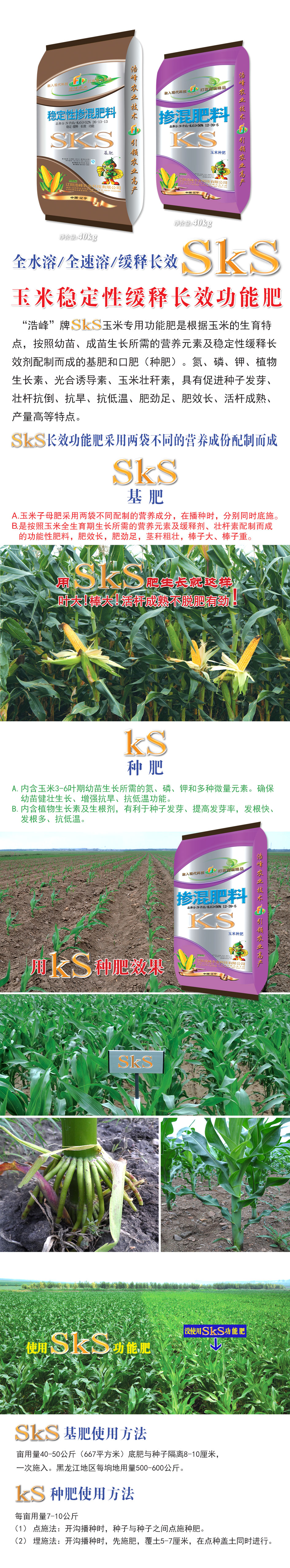 “浩峰”牌sks玉米專用功能肥是根據玉米的生育特點,按照幼苗、成苗生長所需的營養(yǎng)元素及穩(wěn)定性緩釋長效劑配制而成的基肥和口肥(種肥)。氮、磷、鉀、植物生長素、光合誘導素、玉米壯稈素,具有促進種子發(fā)芽、壯桿抗倒、抗旱、抗低溫、肥勁足、肥效長、活桿成熟、產量高等特點。
