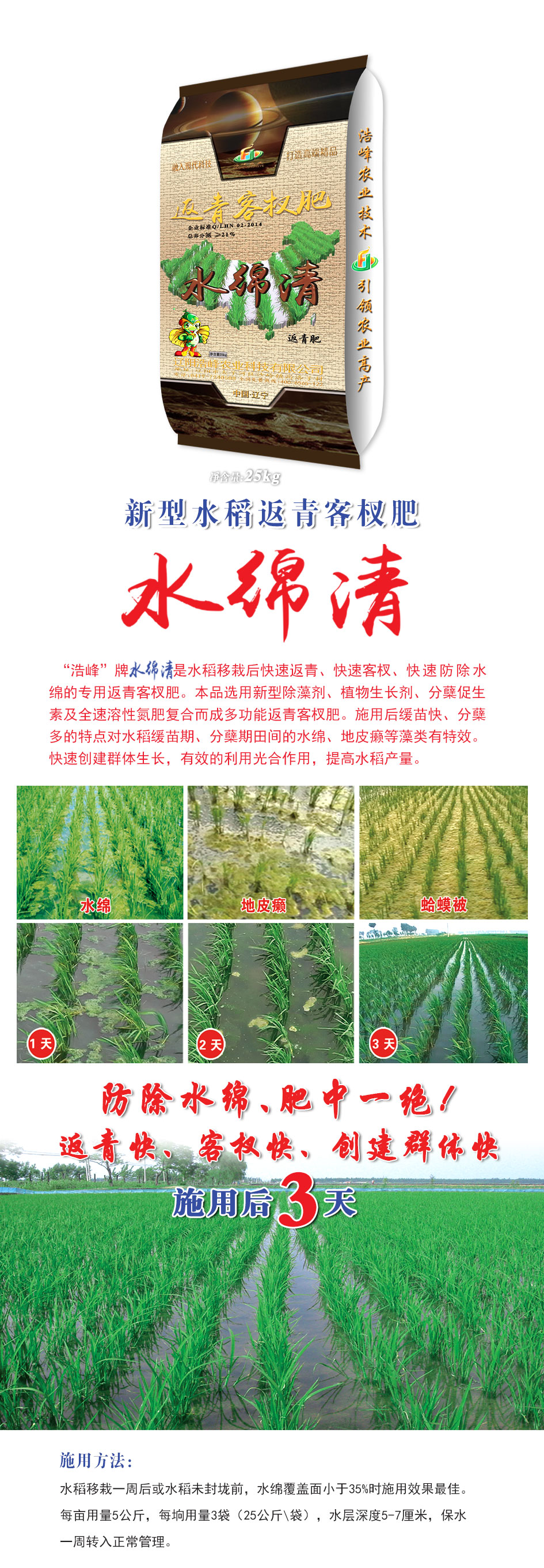 “浩峰”牌 是水稻移栽后快速返青、快速客杈、快速防除水綿的專用返青客杈肥。本品選用新型除藻劑、植物生長(zhǎng)劑、分蘗促生素及全速溶性氮肥復(fù)合而成多功能返青客杈肥。施用后緩苗快、分蘗多的特點(diǎn)對(duì)水稻緩苗期、分蘗期田間的水綿、地皮癩等藻類有特效。快速創(chuàng)建群體生長(zhǎng),有效的利用光合作用,提高水稻產(chǎn)量。
