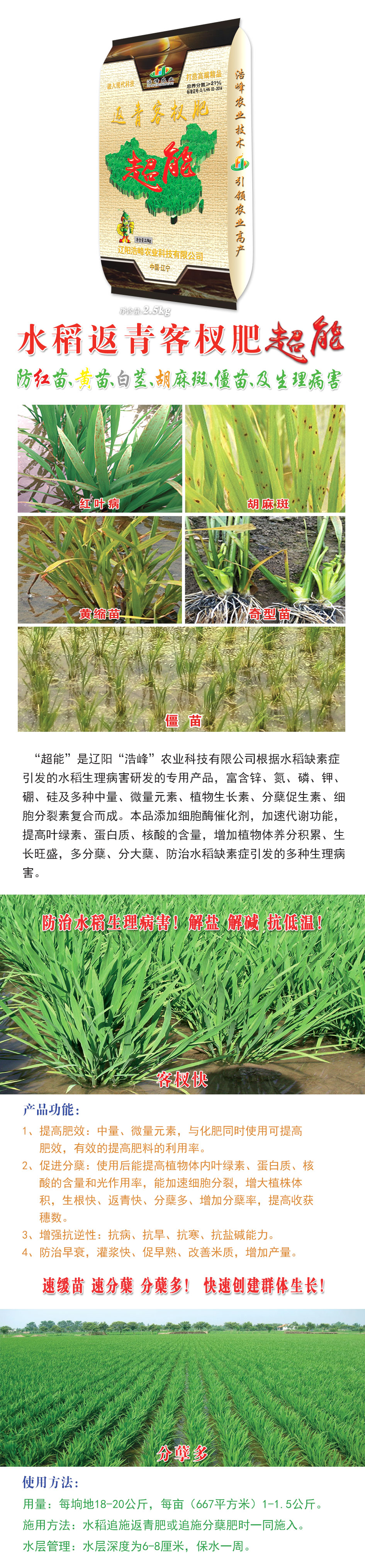 “超能”是遼陽“浩峰”農(nóng)業(yè)科技有限公司根據(jù)水稻缺素癥引發(fā)的水稻生理病害研發(fā)的專用產(chǎn)品,富含鋅、氮、磷、鉀、硼、硅及多種中量、微量元素、植物生長素、分蘗促生素、細胞分裂素復(fù)合而成。本品添加細胞酶催化劑,加速代謝功能,提高葉綠 、蛋白質(zhì)、核酸的含量,增加植物體養(yǎng)分積累、生長旺盛,多分蘗、分大蘗、防治水稻缺素癥引發(fā)的多種生理病害。